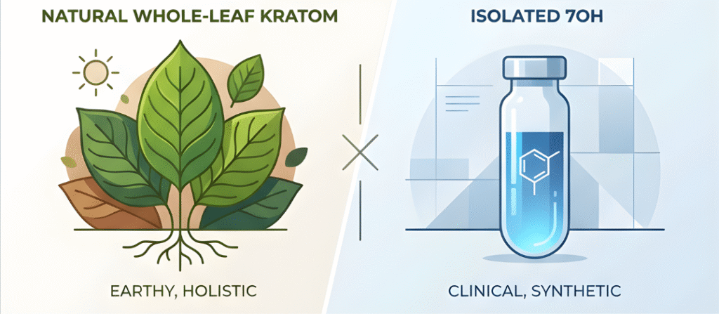 In short: 7OH doesn’t reflect the natural kratom experience. It’s isolated, unpredictable, and often the cause of misunderstandings around kratom’s safety.
