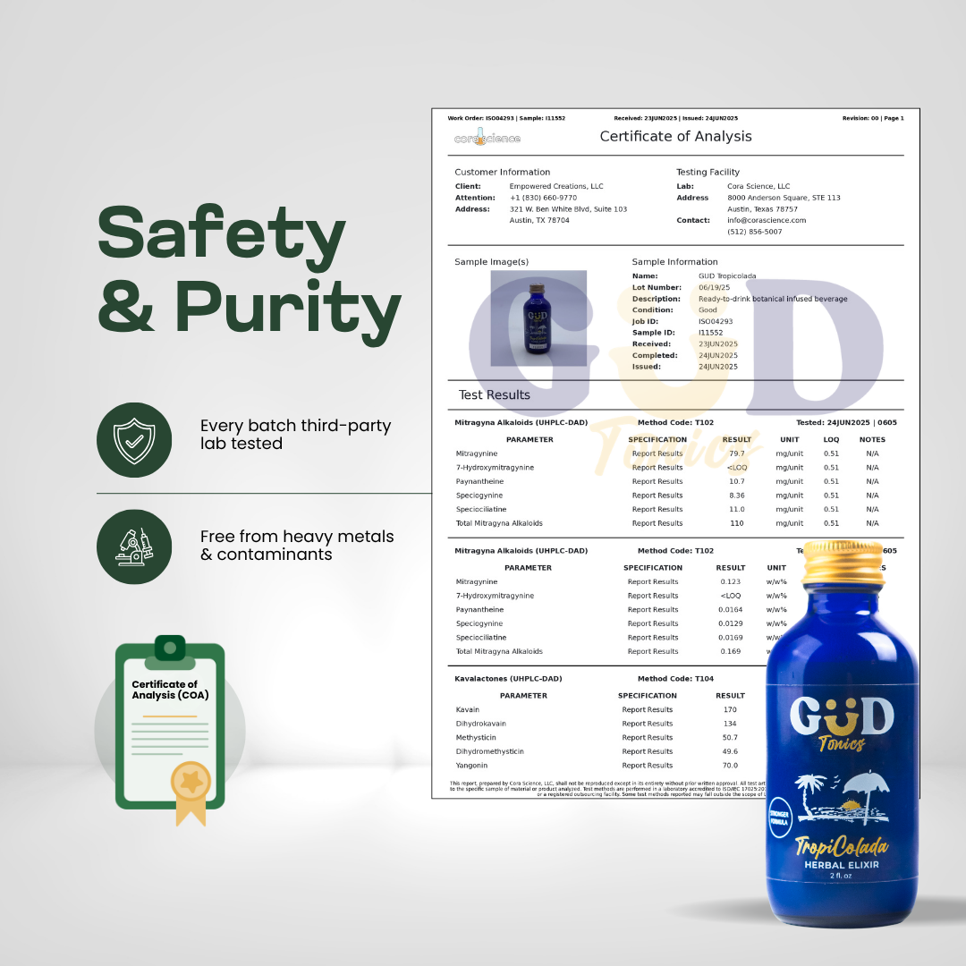 Step into the sunshine with GÜD Tonics Kava Kratom Extract - TropiColada, the newest evolution in kava elixirs. Word on the beach is this herbal elixir, a tropical symphony of kava and kratom extracts, is about to make your wellness journey better than ever. Now, let’s dive into the remarkable beverage that’ll help you live the GÜD life.